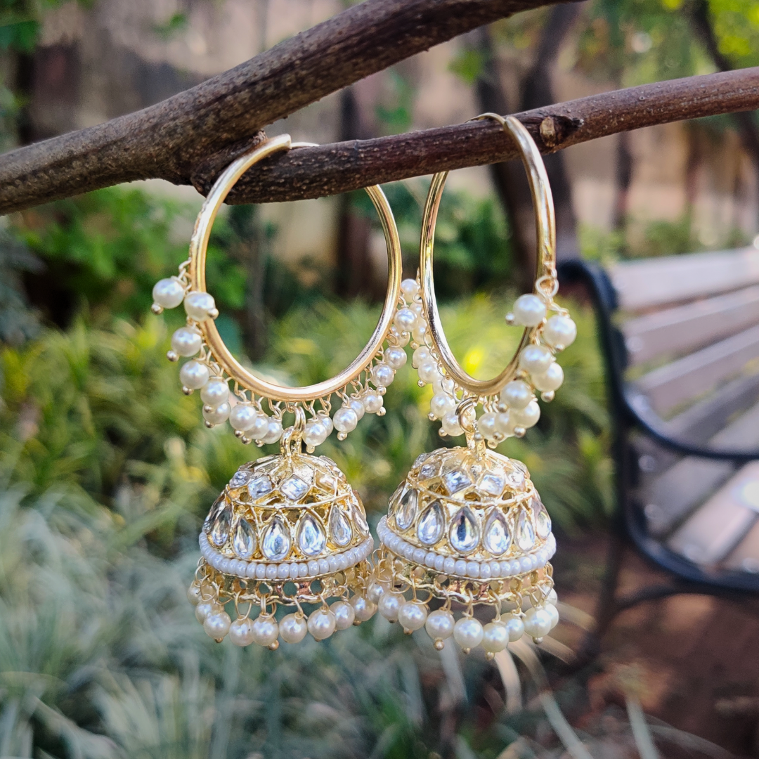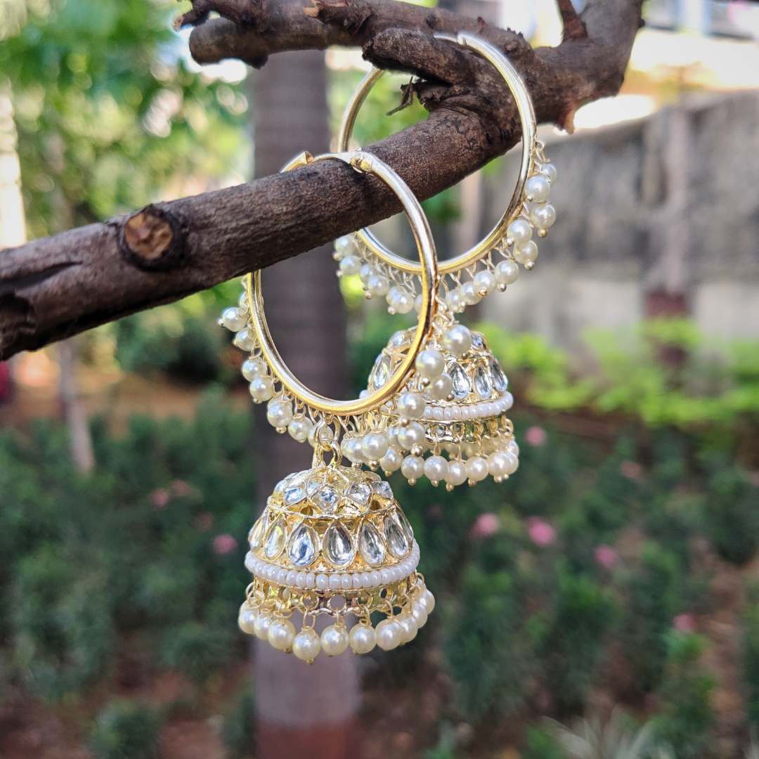Discover the perfect blend of tradition and fashion in these elegant hoop jhumkas. Shop now to unlock your unique style potential and experience the timeless allure of Golden Kundan Pearl Hoop Jhumkas.