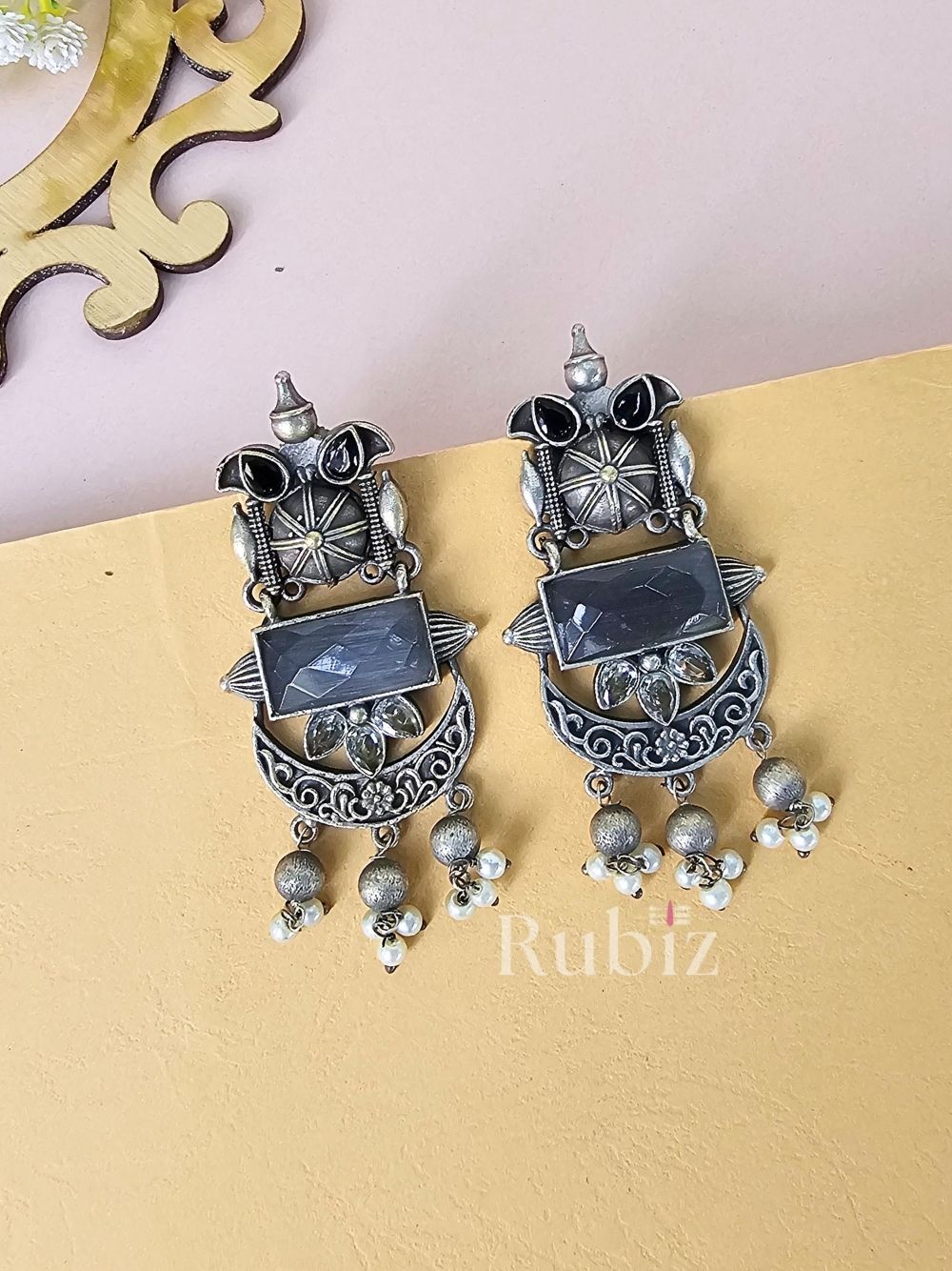Elevate your elegance with our exquisite Grey Ruchita Danglers. These beautiful ethnic earrings are crafted from Stone and German Silver.