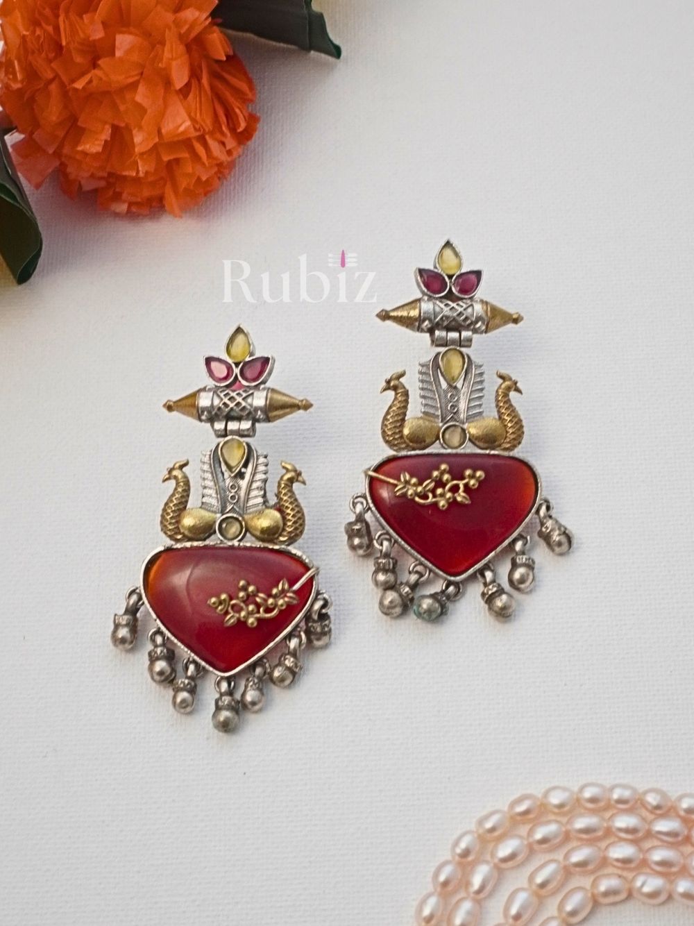 Elevate your elegance with our exquisite Red Sunanya Danglers. These beautiful ethnic earrings are crafted from Stone and German Silver.