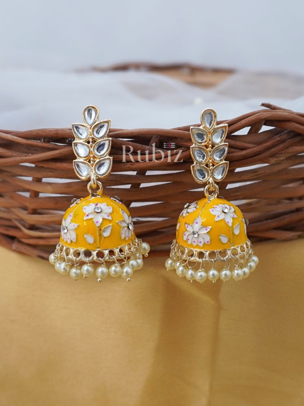 Elevate your elegance with our exquisite Yellow Hima Jhumkas. These beautiful ethnic earrings are crafted from Kundan, Meenakari & Alloy.